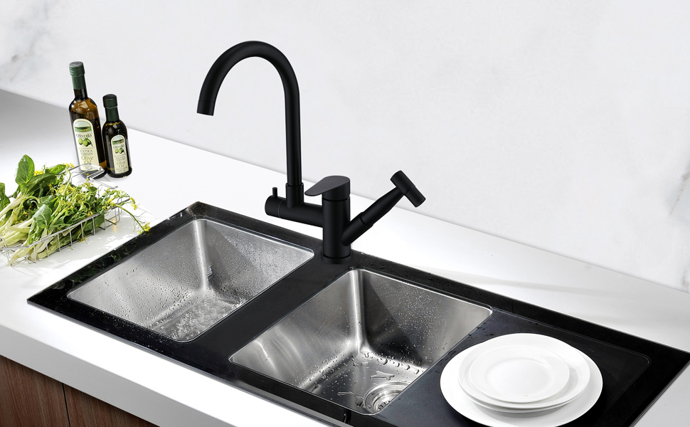 • Küchenarmatur mit ausziehbarer Brause: 360° drehbar + ausziehbare Brause, leicht zwischen den beiden Spülbecken zu drehen und bequem, um die Ecken des Spülbeckens zu reinigen.