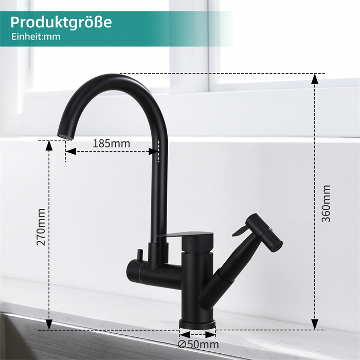 • Spültischarmatur mit 2 Wasserabgängen: Wasserabgang des Wasserhahns + Wasserabgang der Brause, beide Wasserabgangsmodi können nach Belieben umgeschaltet werden.
